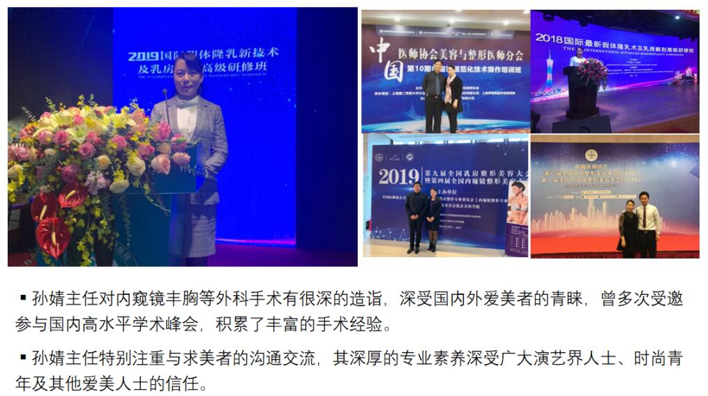 孫婧,國內(nèi)內(nèi)窺鏡雙平面技術(shù)先鋒,深V動感豐胸資深專家。早年在南方醫(yī)院整形外科進修,專業(yè)從事胸部整形15年,親身經(jīng)歷了國內(nèi)隆胸技術(shù)數(shù)次變革。她敏銳地跟隨每次技術(shù)潮流的發(fā)展步伐,第一時間投身于先進技術(shù)的學習與研究,積累了豐富的手術(shù)經(jīng)驗,并多次被邀請到國內(nèi)外隆胸實操比賽當中進行技術(shù)展示。孫婧主任在手術(shù)當中展現(xiàn)出的嫻熟與專業(yè)為她贏得了業(yè)內(nèi)外的一致好評,上萬例成功的手術(shù)案例更是對她技術(shù)水平的最佳鑒證。