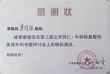 2012年第三屆北京同仁中韓眼鼻整形美容外科專題研討會獲感謝狀