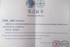 2011年第四屆面部整形美容外科學(xué)術(shù)交流會上獲發(fā)言證書