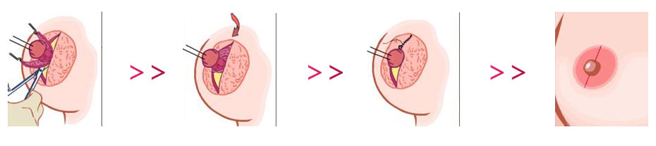 先將凹陷的乳頭提出體表,設(shè)計(jì)乳暈皮瓣,大小根據(jù)凹陷的程度及乳頭的大小而定,將乳頭邊沿分離,仔細(xì)分離和切斷乳腺管間的纖維束,糾正乳頭凹陷。再將部分乳腺組織充分的添于復(fù)位的乳頭下方空隙,固定乳頭頸,后縫合皮膚。