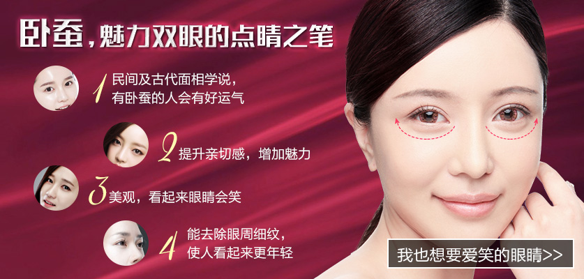 臥蠶,緊鄰睫毛下緣的一條約 4-7 毫米的帶狀隆起物,主要是眼輪肌肉發(fā)達所形成,像一條蠶寶寶橫臥在下睫毛的邊緣,微笑或瞇眼時會更加明顯。好看的眼睛都有臥蠶,不同于眼袋,臥蠶能夠與雙眼皮一樣成為魅力雙眼的點睛之筆。臥蠶成形術能通過手術方法做成臥蠶,讓雙眼更添嫵媚神韻。